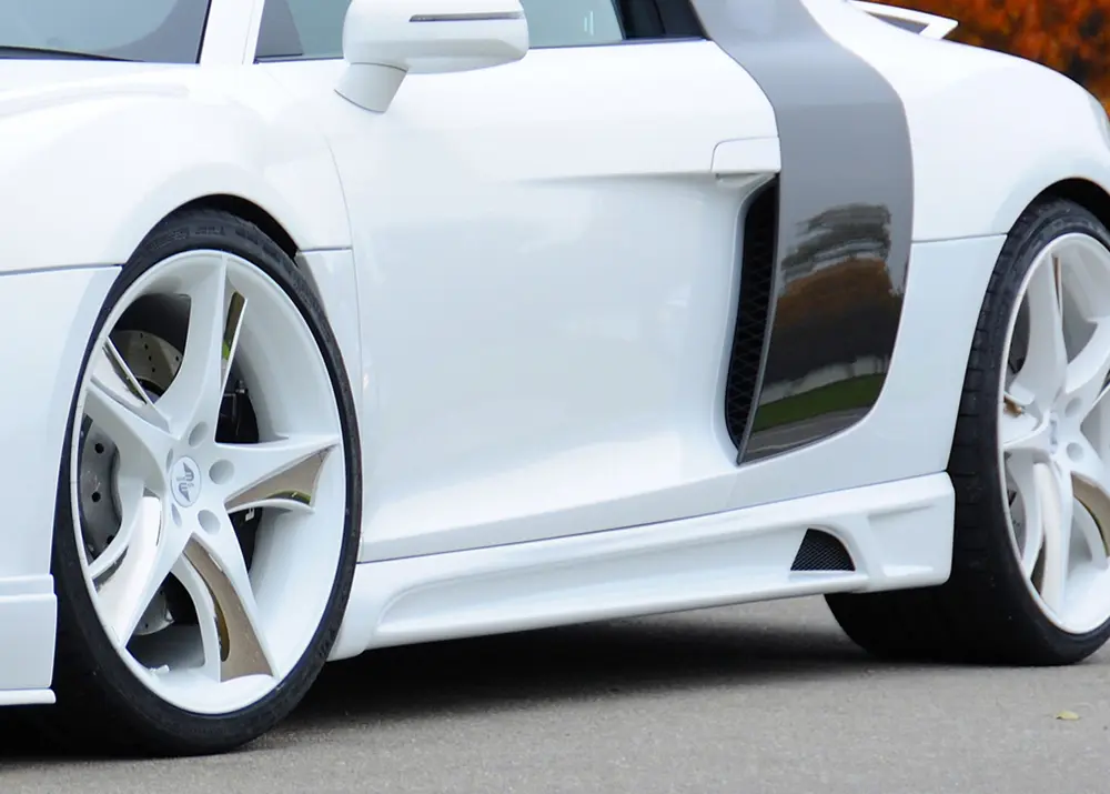 Wenn die Seitenschweller an ein 10-Zylinder Modell montiert werden sollen, müssen zusätzlich die orig. Audi R8-Seitenschweller vom 8-Zylinder nachgerüstet werden.