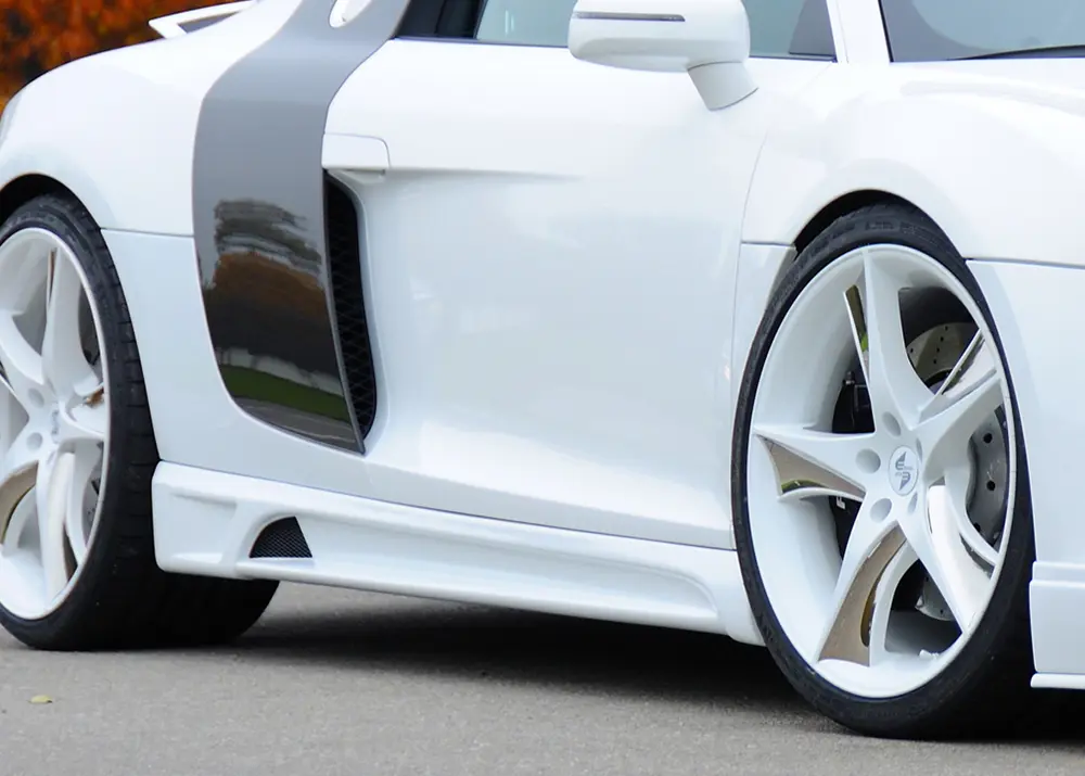 Wenn die Seitenschweller an ein 10-Zylinder Modell montiert werden sollen, müssen zusätzlich die orig. Audi R8-Seitenschweller vom 8-Zylinder nachgerüstet werden.